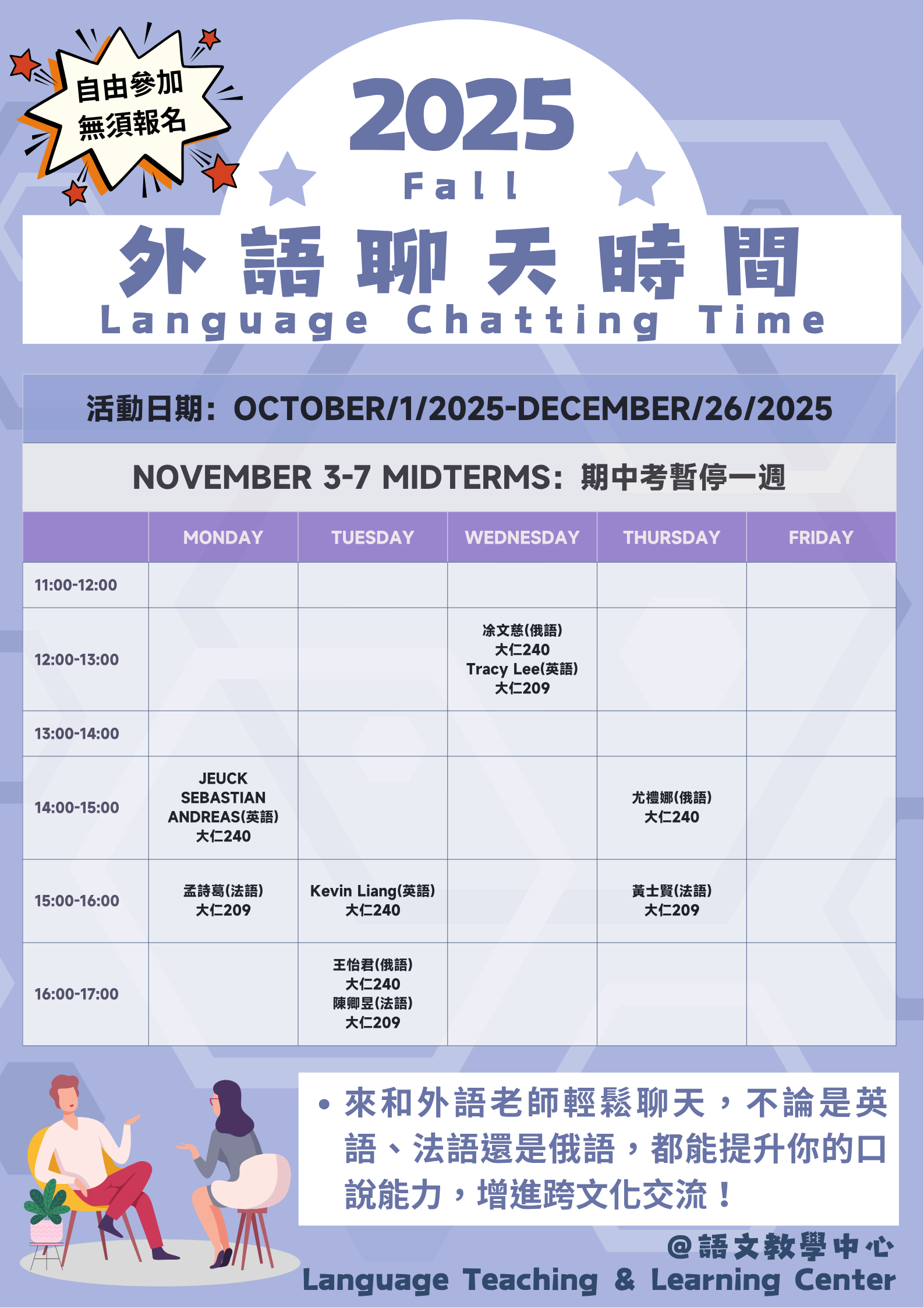 本學期「Language Chatting Time 外語聊天時間」包含英、俄、法語,10月7日正式開始,歡迎同學參加~