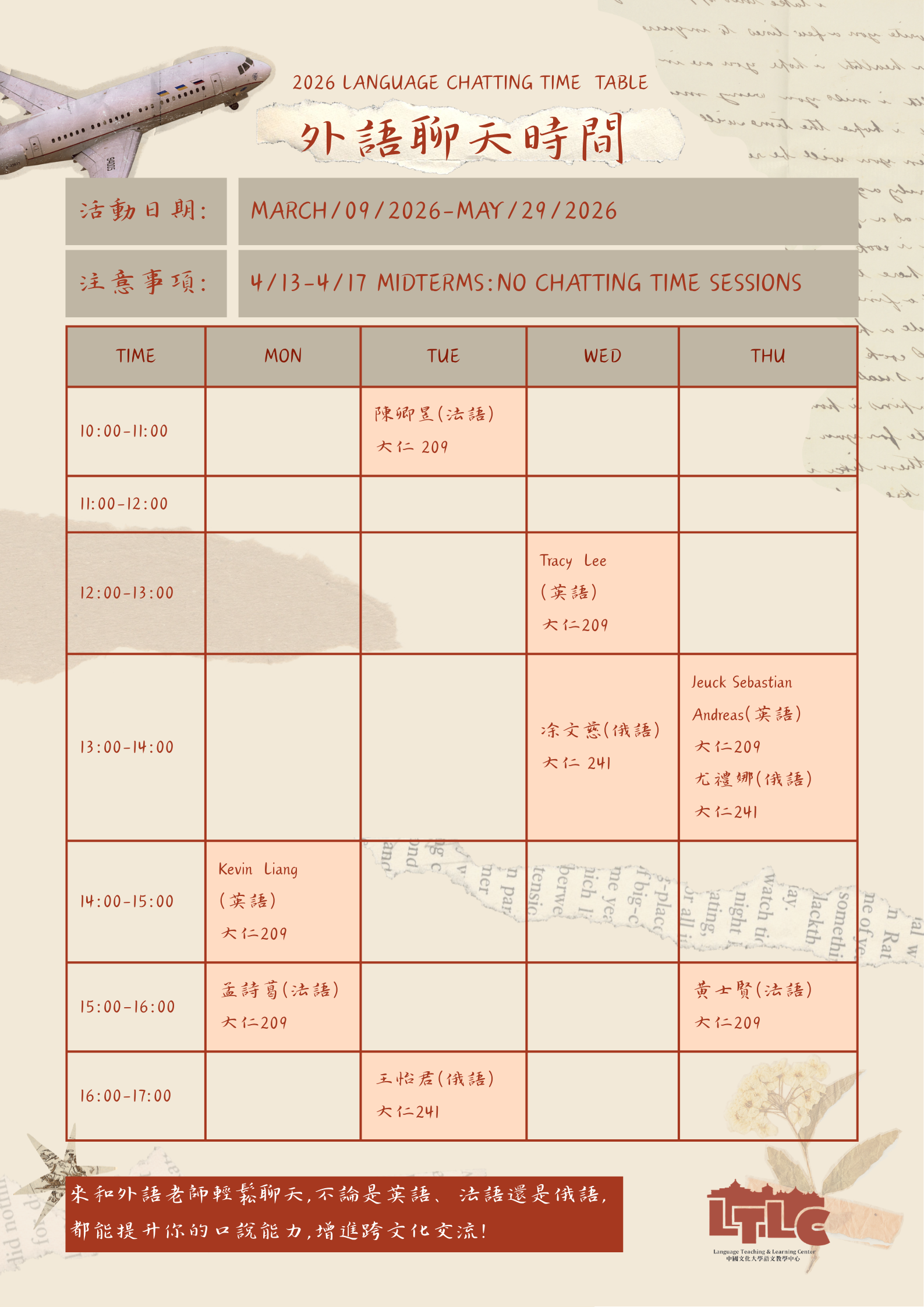 本學期「Language Chatting Time 外語聊天時間」包含英、俄、法語,3月9日正式開始,歡迎同學參加~